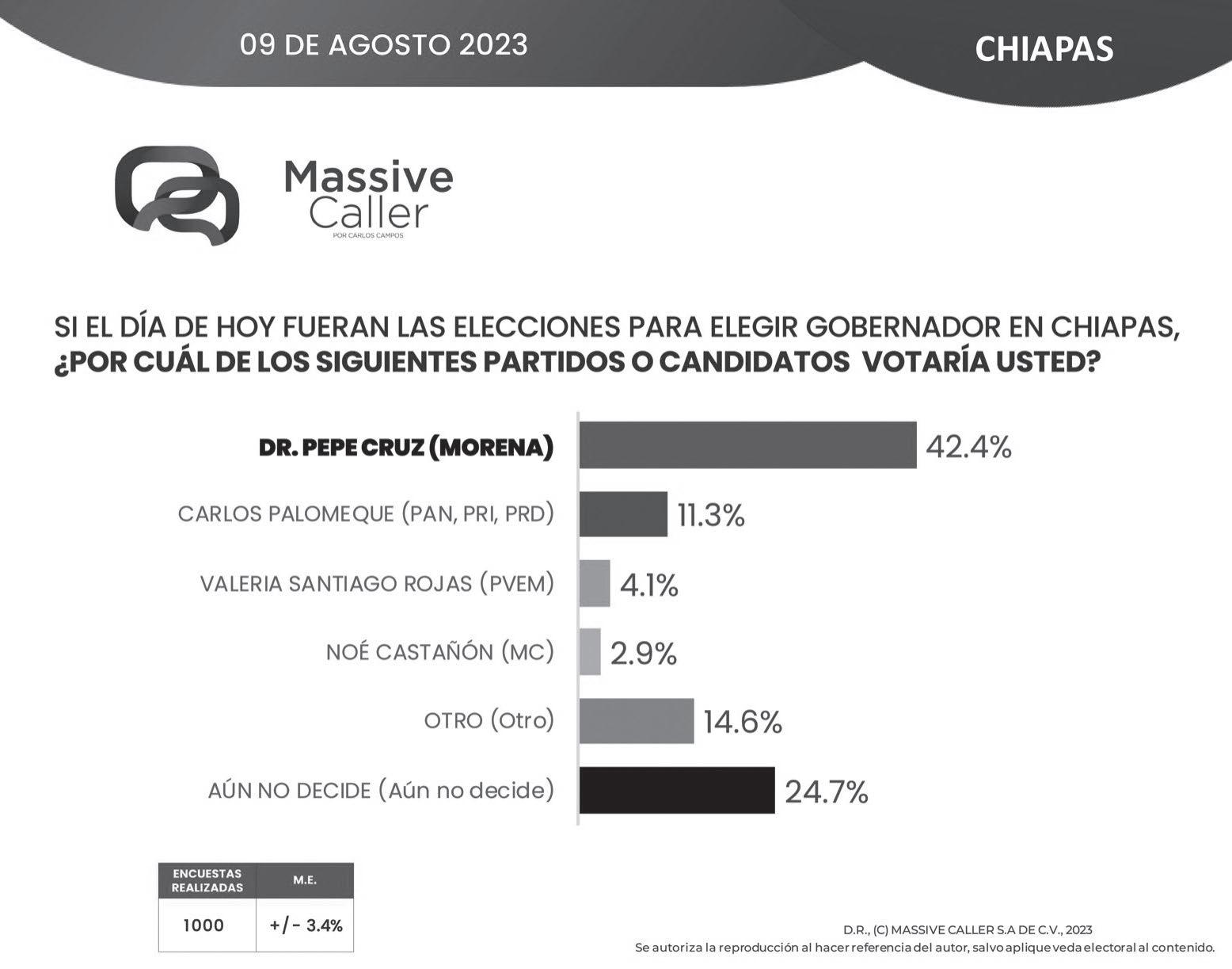 A la pregunta: Si el día de hoy fueran las elecciones para elegir Gobernador en Chiapas, ¿Por cuál de los siguientes partidos o candidatos votaría usted? El 41.6% de las personas encuestadas respondió que por el doctor Pepe Cruz (Morena), mientras que solo el 8.4% dijo que por Rubén Antonio Zuarth Esquinca (PAN-PRI-PRD), el 5.1% por Noé Castañón (Movimiento Ciudadano) y 4.9% por Valeria Santiago Rojas (PVEM).