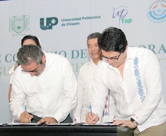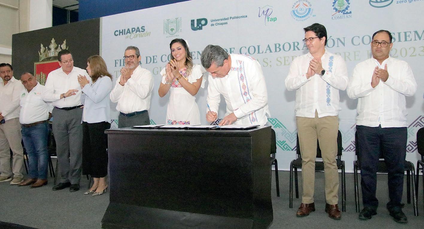 El gobernador Rutilio Escandón Cadenas atestiguó el Convenio de Colaboración entre Siemens Industry Software S.A. de C.V. y universidades públicas de Chiapas, con la finalidad de promover proyectos para el desarrollo de actividades tecnológicas entre las y los estudiantes y académicos, por lo que esta empresa realizó una aportación de 250 millones de pesos en programación de software e instrumentos de alto nivel tecnológico.
