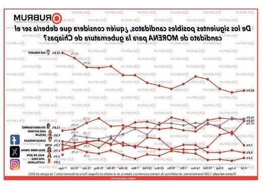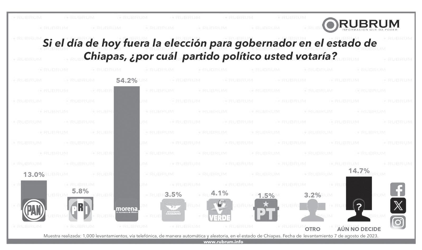 El corte de agosto de las tendencias electorales para Chiapas de la casa encuestadora RUBRUM reporta que el Partido MORENA