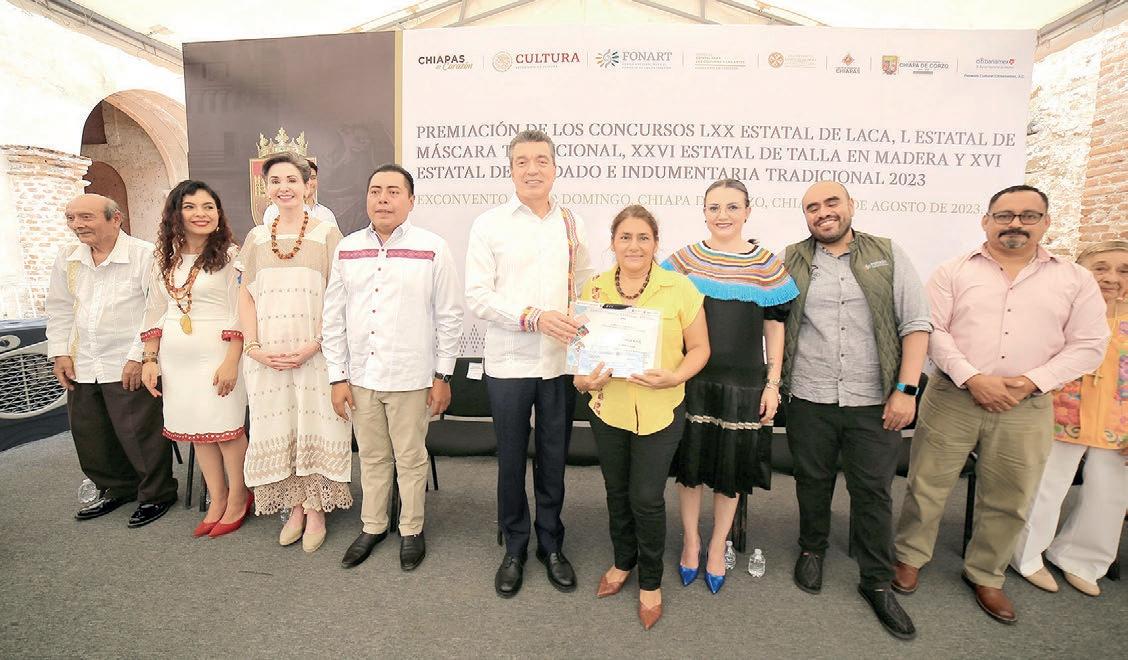 En Chiapa de Corzo, el gobernador Rutilio Escandón Cadenas encabezó la ceremonia de premiación de los concursos estatales de Laca, Máscara Tradicional, Talla en Madera y de Bordado e Indumentaria Tradicional, con lo que se busca reconocer el talento de mujeres y hombres que, a través de las artesanías, hacen que Chiapas se distinga a nivel nacional e internacional.