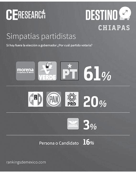 Destino 24, de C&E Research, es la encuesta de preferencia electoral y simpatías partidistas que cada mes mide el crecimiento de los perfiles que aspiran a las candidaturas de los diferentes partidos en Chiapas. De los resultados de agosto de este año se confirma que el Movimiento de Regeneración Nacional en compañía de sus aliados naturales el PVEM y el PT alcanzan ya el 61% de simpatía, dejando muy atrás al bloque opositor conformado por el PRI, PAN y PRD con el 20%. Hasta el último está Movimiento Ciudadano con el 3%.