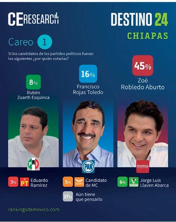 Desde hace más de un año Zoé Robledo encabeza las preferencias entre los aspirantes a la candidatura de Morena. Su trabajo en el Seguro Social, su cercanía al Presidente López Obrador y su identificación con la lucha del movimiento le dan un 27%, seguido de Eduardo Ramírez con un 19% y en un tercer lugar se ubica la alcaldesa de Tapachula, Rosa Irene Urbina, con un 7%.