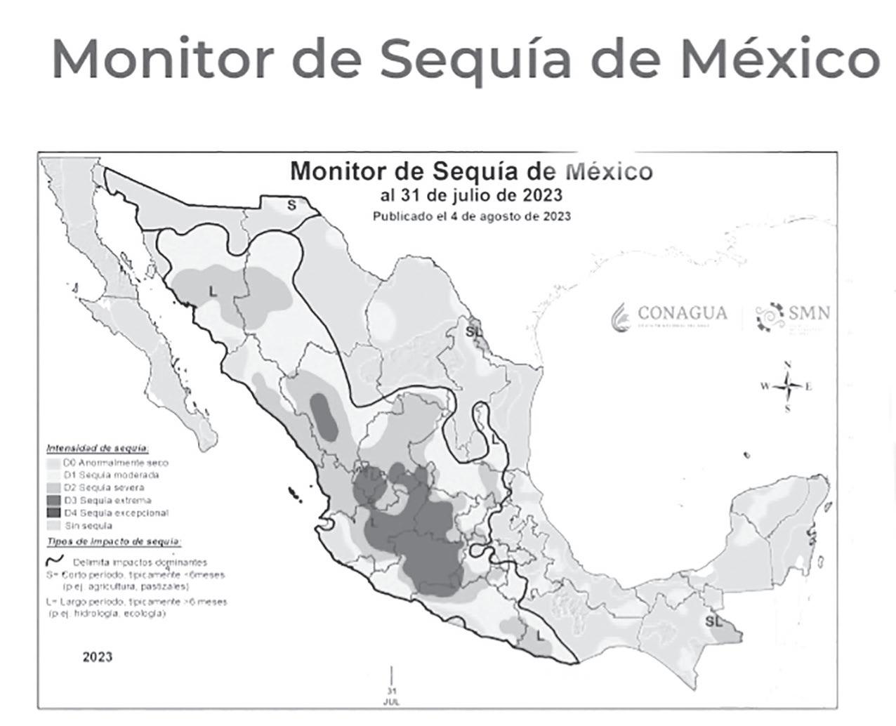 El informe subraya que al 31 de julio de 2023 el porcentaje de áreas con sequía de Moderada a Extrema a nivel nacional fue de 49.35%, 6.09% mayor que lo cuantificado al 15 de julio del mismo año.