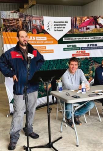Le chercheur Yann Surget-Groba explique le scientifique.projet À sa droite se trouvent Alain Faucher, le propriétaire de l’érablière, et Éric Cliche, le directeur général de l’APBB.