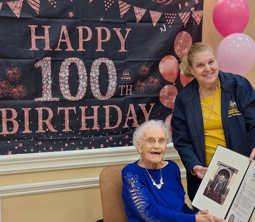 Lisa Borine of Senator Christine Tartaglione's office presents Dolly Lafferty with a citation recognizing her 100th birthday!