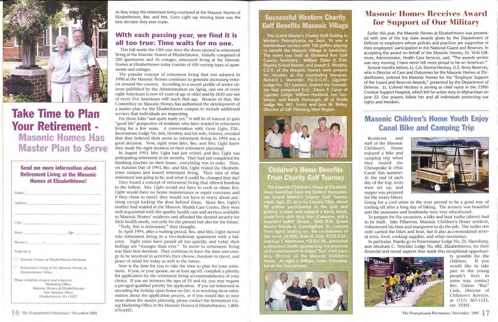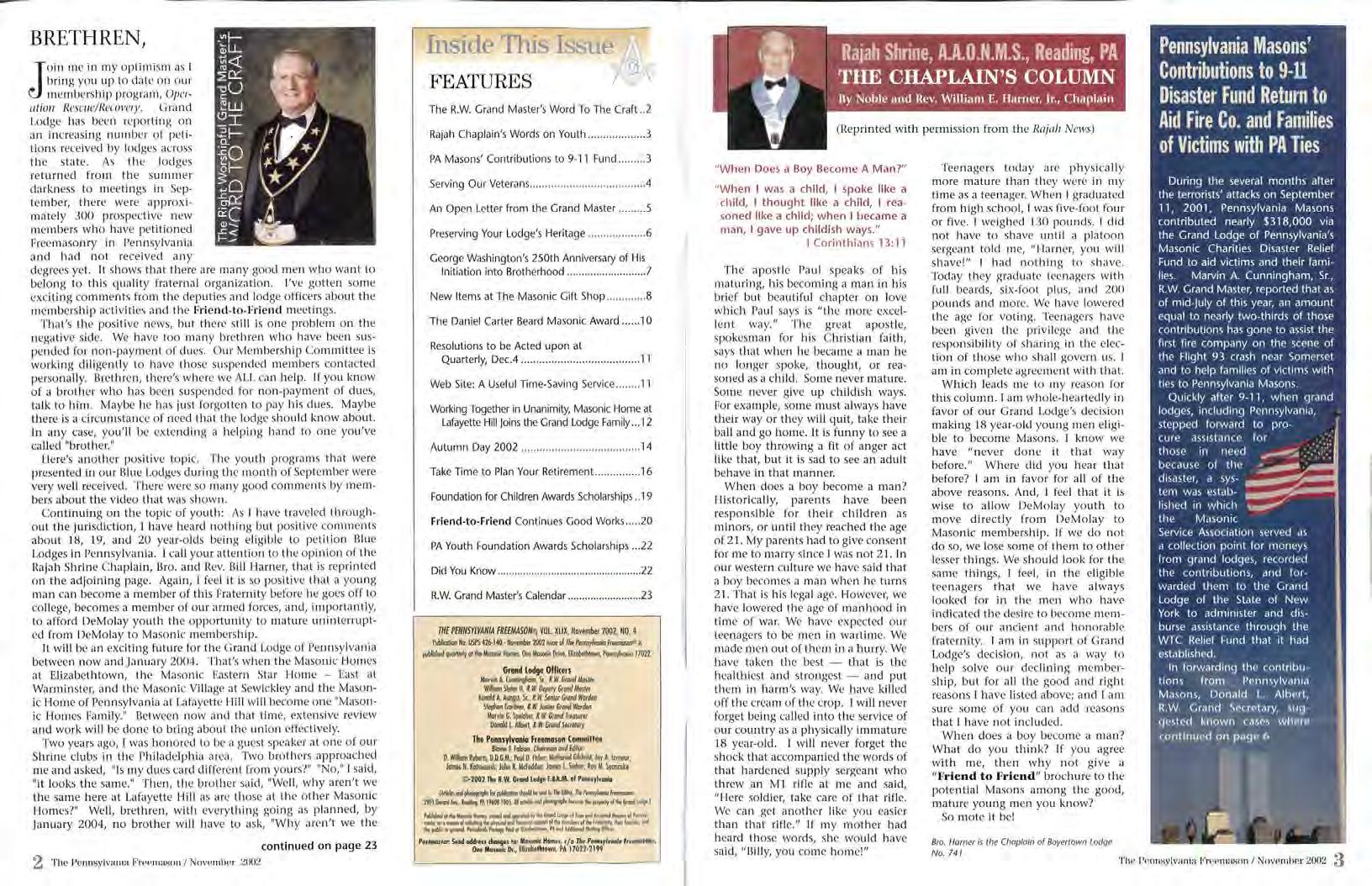 The two Grand Maste r s Charity Golf Outings- in the West at Sew ick l ey Jnd in the East at Lu lA< Cou<1t r y l.lub - were bo th su('cessfu l ' "'d e njoyab l e The Masonic Vi ll age at Sewick l ey and the Masonic Ch il d r en's HOmC' a t EliZt1bCthtown were the bene fi c i ari es t h ey the suppo rt Please no l e that th <' next Q u arte rl y Communica ti on w i ll be at 10 o'clock a.m., Wednesday, Dec. 4, in the Masonic Phil adelphia. Brethren, we have passed the first ann versary of t h <' evil events I hat look p ace on SCpl. 11, 2001. tel u s continue to s tand flrm iu our pat <Lntl m aintain a of ou r h eroes who served mankind ;o valia ntl y. Likewise, let's not forget that November is th e month we honor all o f our veterans