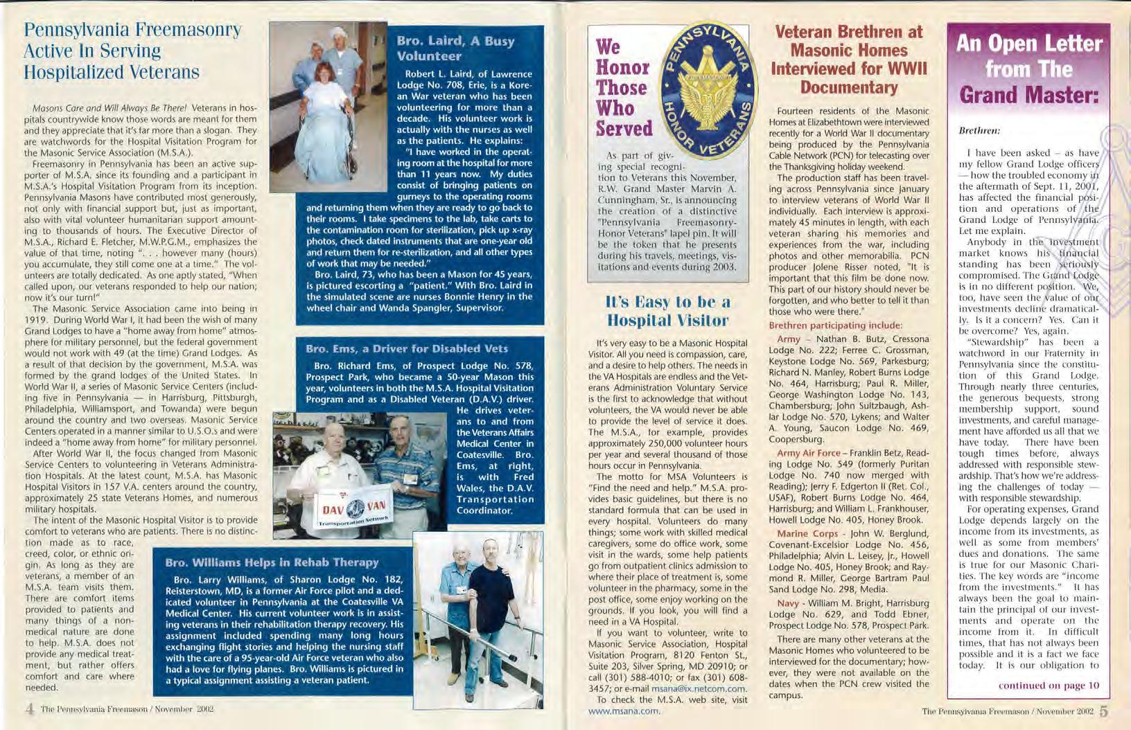 Freemasonry in Pennsylvania has been an active supporter of M.S.A. since its founding and a participant in M.S.A.'s Hospital Visitation Program from its inception. Pennsylvania Ma sons have contributed most geo;erously, not only with financial support but, just as important, also with vital volunteer humanitarian support amounting to thousands of hours. The Executive Director of M.S.A., Richard E. Fletcher, M.W.P.G.M., emphas izes the value of that time, noting " .•. however many (hours) you accumulate, they still come one at a time." The volunteers are totally dedicated. As one aptly stated, "When called upon, our veterans responded to help our nation; now it's our turn!"