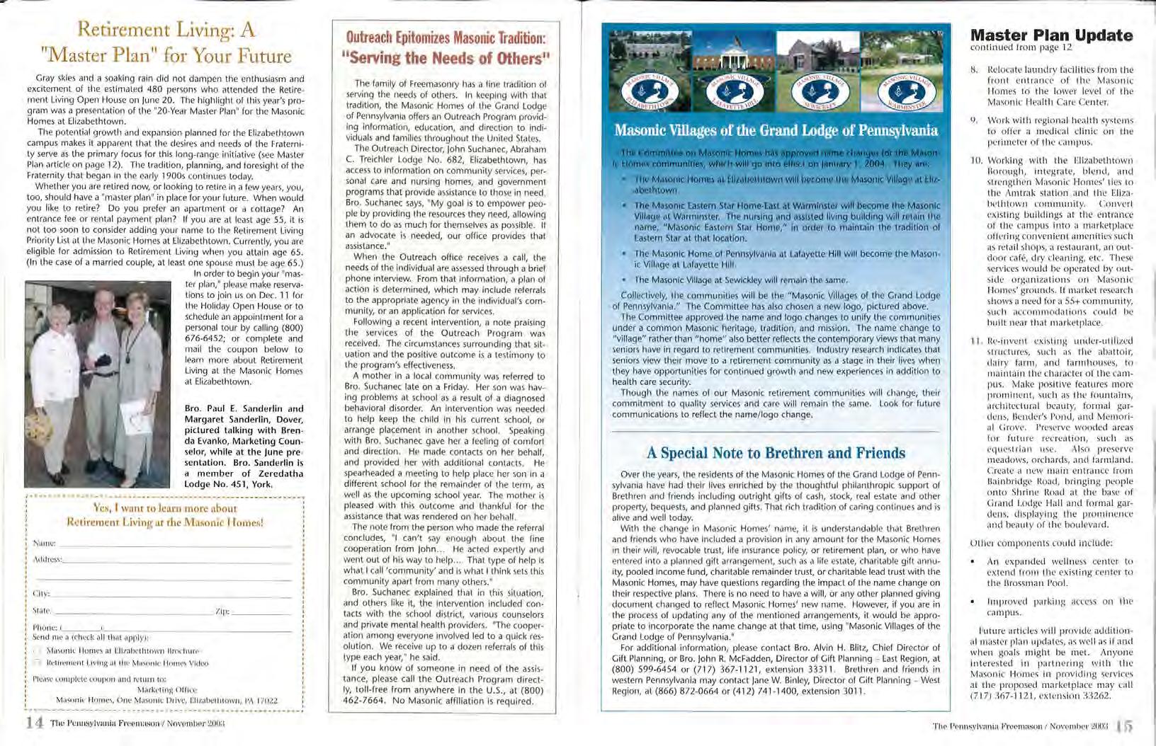 With t he cha n ge in Mason i c Homes' name, it is understandabl e that Brethren and friend s w h o h ave inc lu ded a prov sion in any am ount fo r the Maso n ic Homes in their will, revoca b le trust, ife insu rance policy, or reti remen t p lan, or who have el' le t ed into a planned g ifl arra ng ernen t, such iiS a life es ta te, c haritable g ift ty, poo led in com e fu n d , ch arita b le rema i nd er t rus t, or charitab l e lead tru st with the Ma son ic H omes, m ay h av e q uestion s rega rding the i mpac t o f the nam e ch an ge o n t heir resp ective p lans. Th ere is n o need t o h ave a will, or an y oth er p l an ned givi n g doc u me n t cha n ged t o reflect Masonic new na m e lowever, if you are i n t h e p rocess ol upd a ting an y o f th e me nt ioned arran ge m ent s, i t w o u l d b e app ro· p ri ate t o incorp orate the n ame ch ange a t that ti m e, us ing "M asonic Village s o f the Grand o d ge o f Pen nsy va nia .'