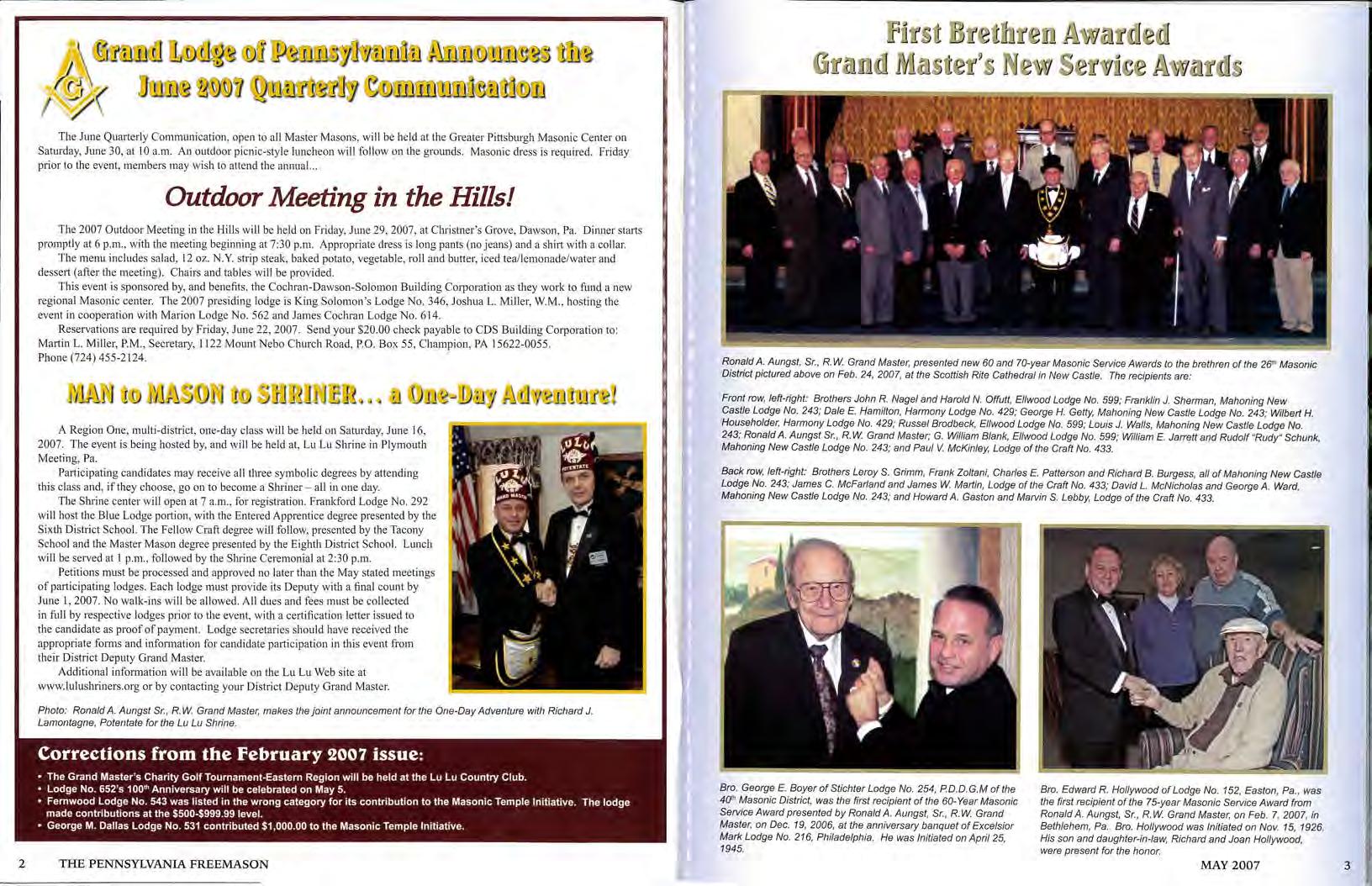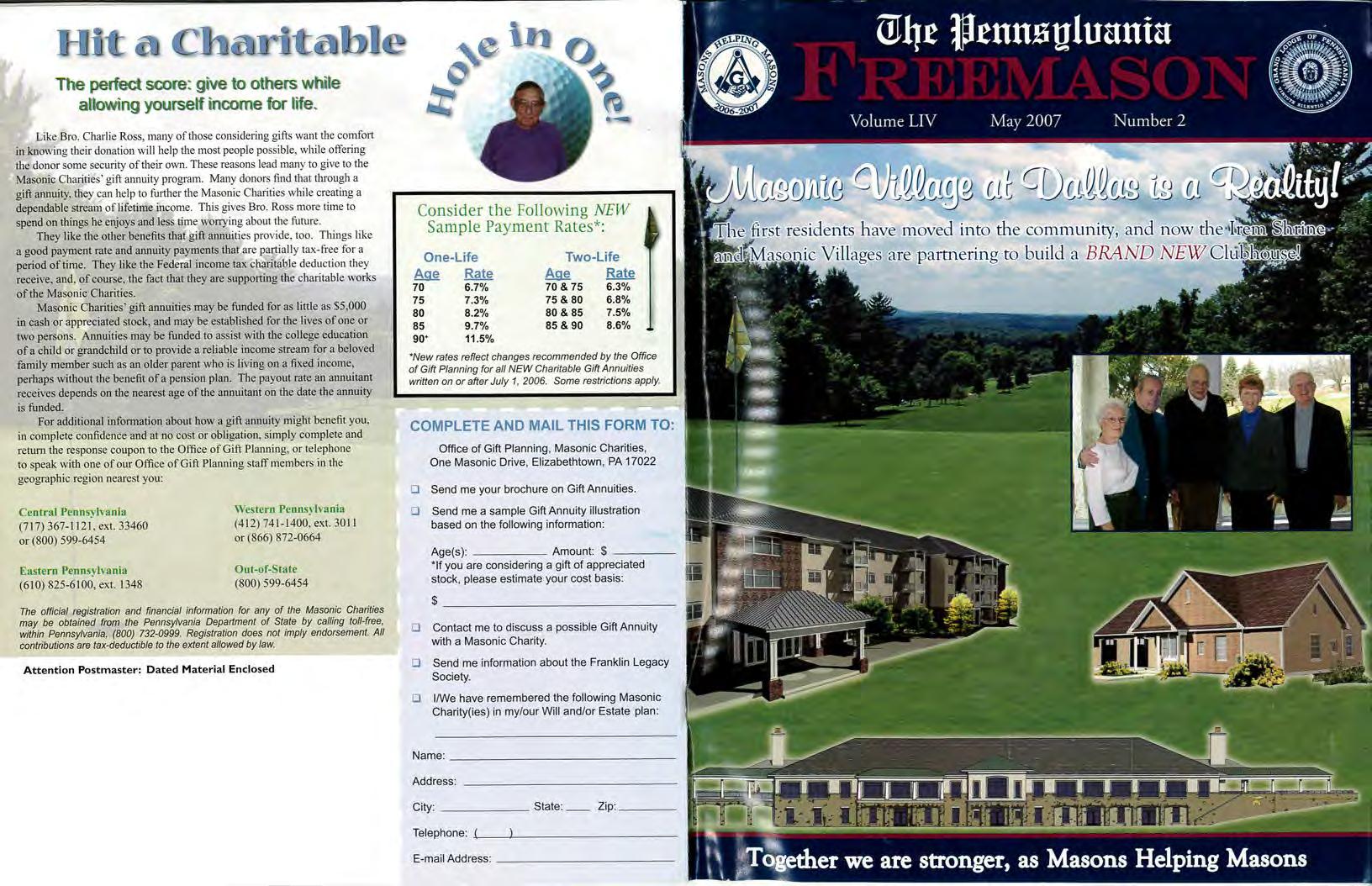(Act of Oct. 23, 1962; Sect on 4369; Trtle 39, United States Code) May 1, 2007, The Pennsyl vania F reemason• published quarterly by f the Masonic Villages, Elizabethtown, PA 17022. Publishers: The Right Wo rshipful Grand Lodge o f the Most Ancient and Honorable F raternity of Free and Accepted Masons of Pennsylvania. Ed itor: Ronald A Aungst , S r Owner: The Right Worship ful Grand Lodge of the Most Anci ent and Honorable Fraternity of F ree and Accepted Masons of Pennsylvania. Known bondholders: none No adve rtising handled Free distribution ave rag es 150,000 each quarter. I that the statements made by me are correct and complete.