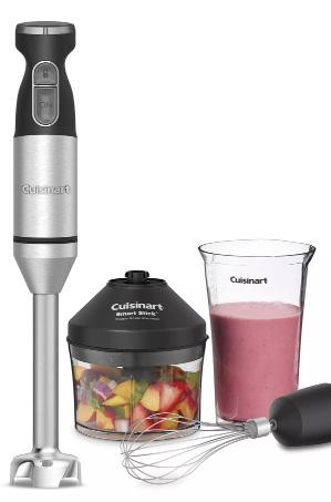 Cuisinart Smart Stick hand blender Chop your mealprepping time in half with Cuisinart’s Smart Stick Hand Blender, which can puree soups and sauces, blend fruit juices and smoothies, and emulsify mayonnaise and other condiments. The powerful blender is equipped with a 300-watt DC motor and features an 8-inch stainless-steel blending shaft, a chopper/ grinder attachment, a whisk and a three-cup measuring cup. $69.95 at Crate and Barrel