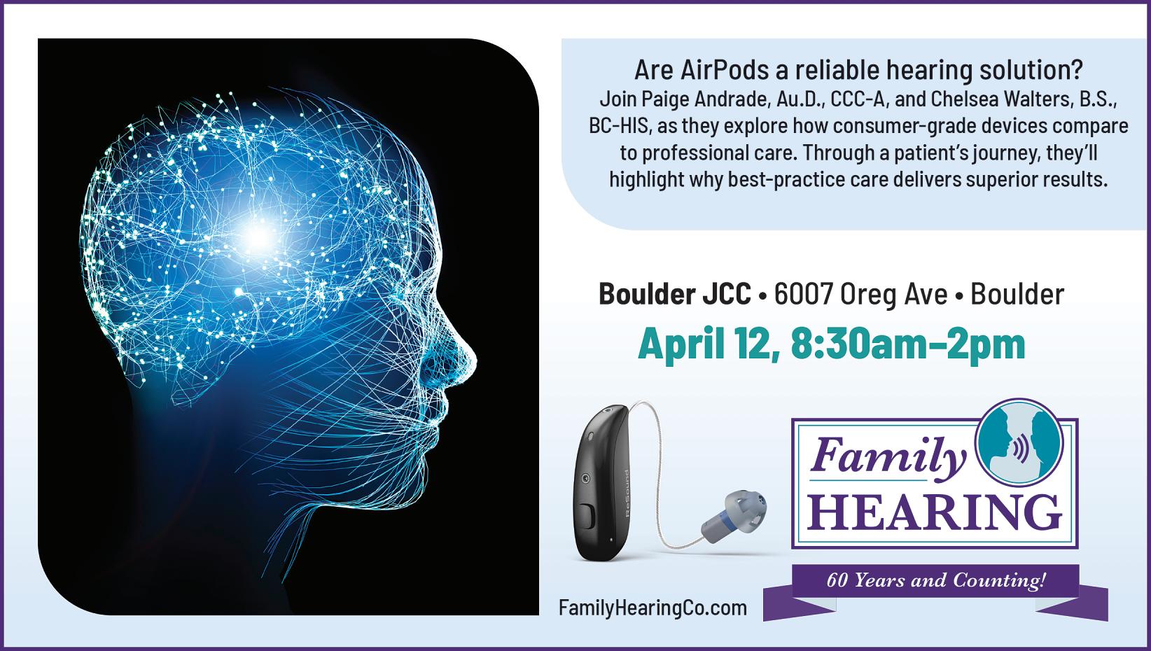 9:30 to 9:50 a.m.| TheAirPods Debate:CanTheyReplace Traditional HearingAids?, presented byPaigeAndrade, Au.D.,CCC-A,andChelsea Walters,B.S.,BC-HIS,Family Hearing Center