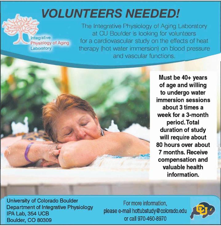 The Integrati ve Physiology of Aging (IPA) Lab at CU Boulder studies the effects of lifestyle and nutraceutical interventions on slowing or rever sing the declines in blood vessel, physical, and brain function that can occur with age. The IPA Lab is currently recruiting volunteer s for several ongoing studies. Participants recei ve health information generated from the study and compensation for time and travel.
