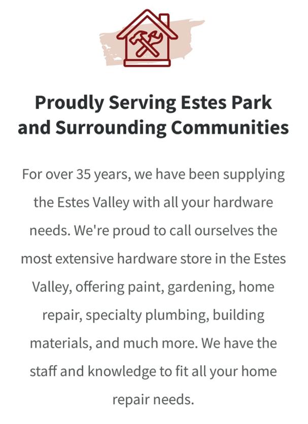 Shop online at www.parksupplyhardware.com and get Free Shipping on all Ship-to-Store orders! 970-586-6305 411 HWY 7 ESTES PARK Monday-Friday: 7:00 AM-5:00 PM Saturday: 7:00 AM-12:00 PM Sunday: Closed Park Supply Paint Store Visit our new shop dedicated to paint and painting accessories in the building right next to the original Park Supply! Proud carrier of Benjamin Moore Paints, Rust-oleum, and Best Look Rental Department Need a piece of equipment for you next project? Browse our wide selection of rental equipment to get started today! | HOME GUIDE FRIDAY, FEBRUARY 24, 2023 18