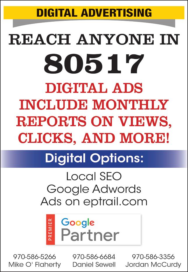 Mention this ad for $100 off 970-412-4704 www.estesvalleyasphalt.com • Asphalt Paving – Seal Coating –Crack Filling – Patching – Striping • Commercial & Residential • Locally owned and licensed in Estes Park • Payment Plans & References available • All work warrantied! Mario Lopez Owner estesvalleyasphalt@yahoo.com jobs of $1000 or more Limited-time offer Price for Life: Valid for residential customers who add new TDS Internet service, existing TDS Internet customers who add qualifying TDS TV+ or TDS phone service, or existing TDS Internet customers who upgrade their Internet service to a higher tier Price for Life covers Internet service only Customers who remove other core services, downgrade to a lower Internet tier, transfer service, suspend service, or disconnect (either voluntarily or for non-payment) service, may lose the Price for Life Offer and be subject to then-current retail rates. Offer available in conjunction with TDS TV+ discount offers. High-Speed Internet: Availability varies and speeds shown may not be available at all service addresses Certain speeds are only offered in areas served by TDS Fiber Speed ranges shown are expressed as “ up to” to represent network capabilities between customer location and the TDS network Most customers can expect to receive a stable speed within the range of the product purchased as allowed by the quality and capability of the connection; however, actual speeds experienced by customers vary and are not guaranteed. Some customers may receive lower than the indicated speed range Speeds vary due to