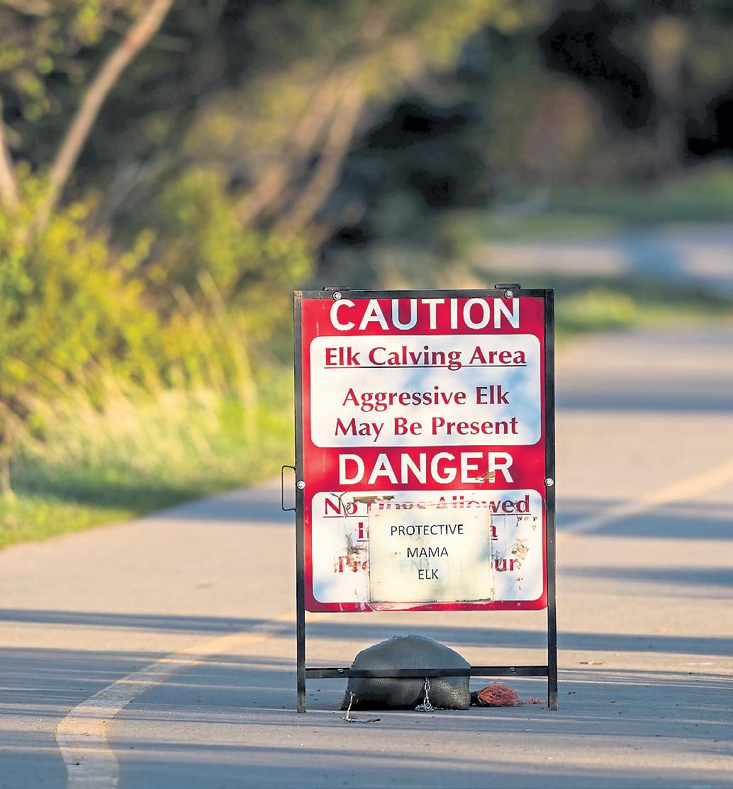 During elkcalving season, look around cornersbefore exitingbuildings or around cornersaselk calves bed down next to buildings, under cars andinbushesand shrubs used in landscaping.Watch a cowelk forsigns of distress, such as pinningdownher ears or intently staring. If a cowdoeschargeorchase you, findsomething sturdy to hide in or behind,likeacar Elkknowfew boundaries, butpeople, however,can make decisionstokeepboth animalsand humans safe Usecommons senseduring calvingseason, keep asafe distance from wildlife and take your time to stay alert to your surroundings. Remember to give them room anduse azoomwhentaking photos.