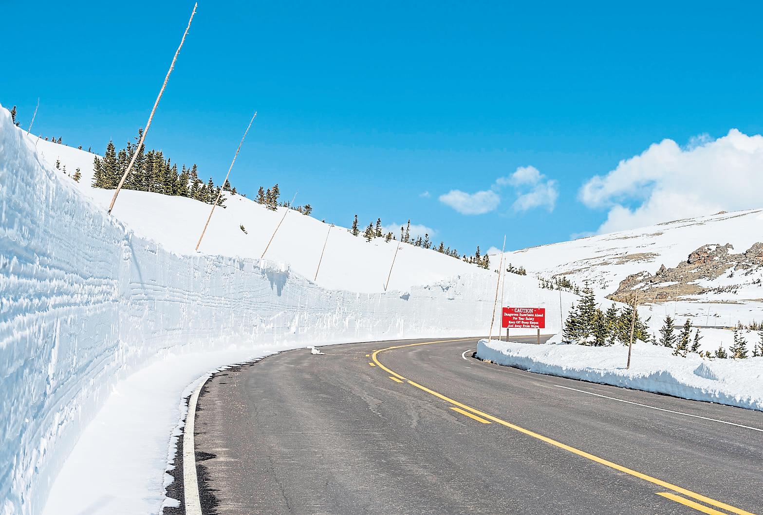 Starting in mid-April, crewsfromRocky Mountain National Park startthe dauntingannualtaskofremoving snow from theroad, pull outs andparking areasalong Trail RidgeRoad. Thesnowcan be up to 22 feet high in some spots, requiringthe crew to chew throughthe snow with plows, shovelsand backhoes in preparationofopening the road by Memorial DayWeekend.