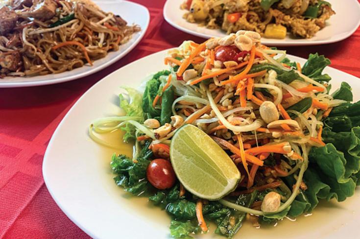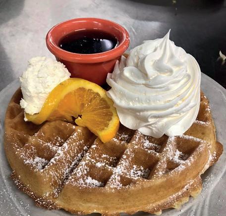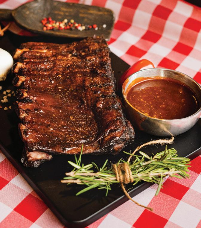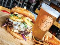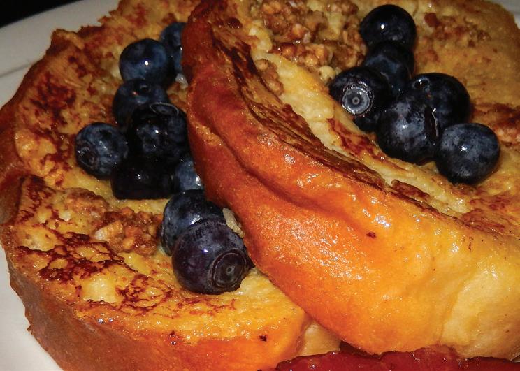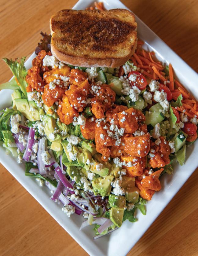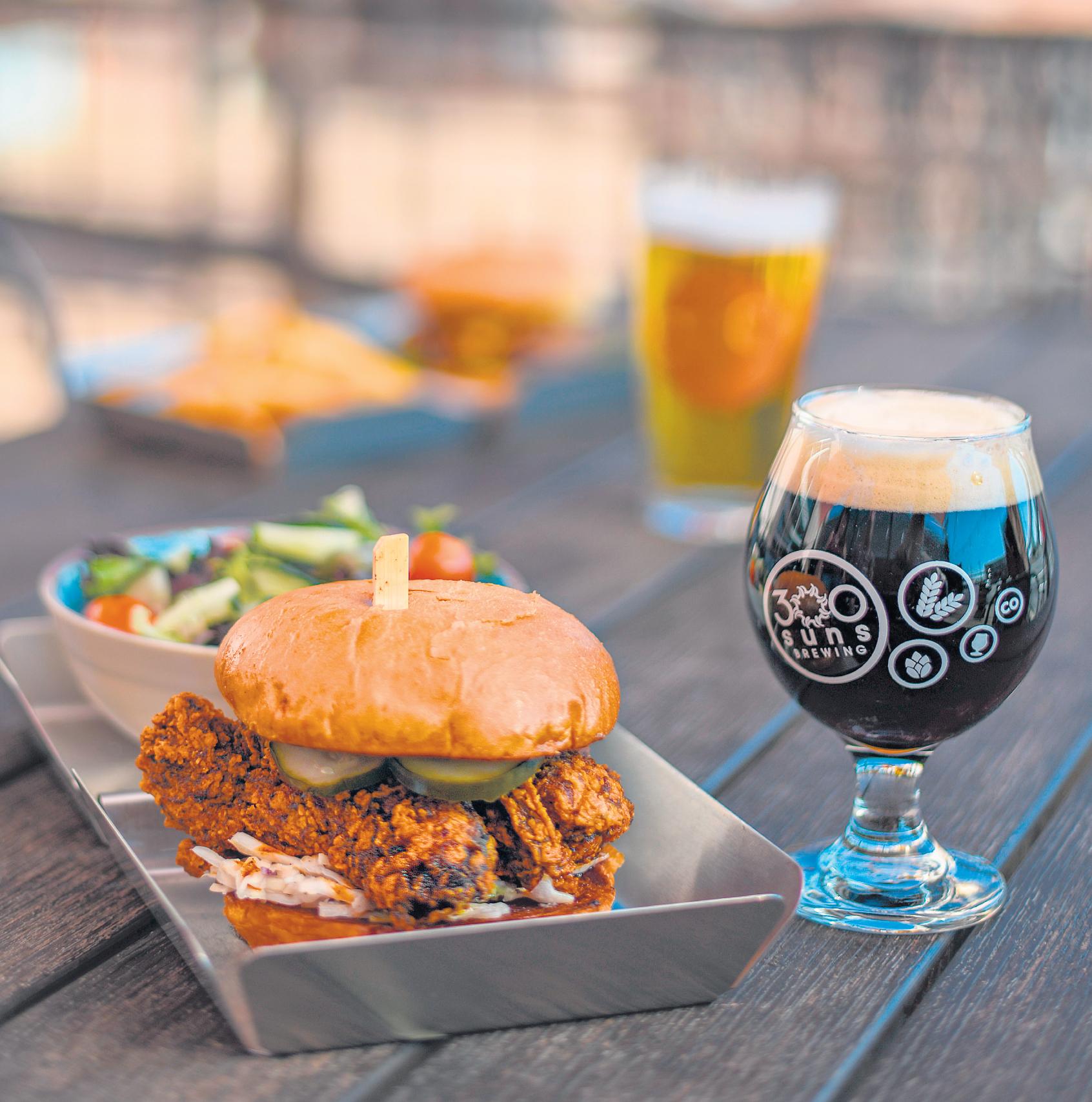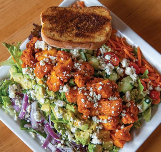 MAIN PHOTO: Buffalo Chicken Salad at Pumphouse Brewery. TOP RIGHT: French toast, eggs and bacon at The Garden Gate Cafe. MIDDLE RIGHT: Scratchmade burger and beer at 300 Suns Brewing BOTTOM RIGHT: BBQ ribs from Georgia Boys BBQ (Photos courtesy: Pumphouse, The Golden Gate Cafe, 300 Suns Brewing and Georgia Boys BBQ).