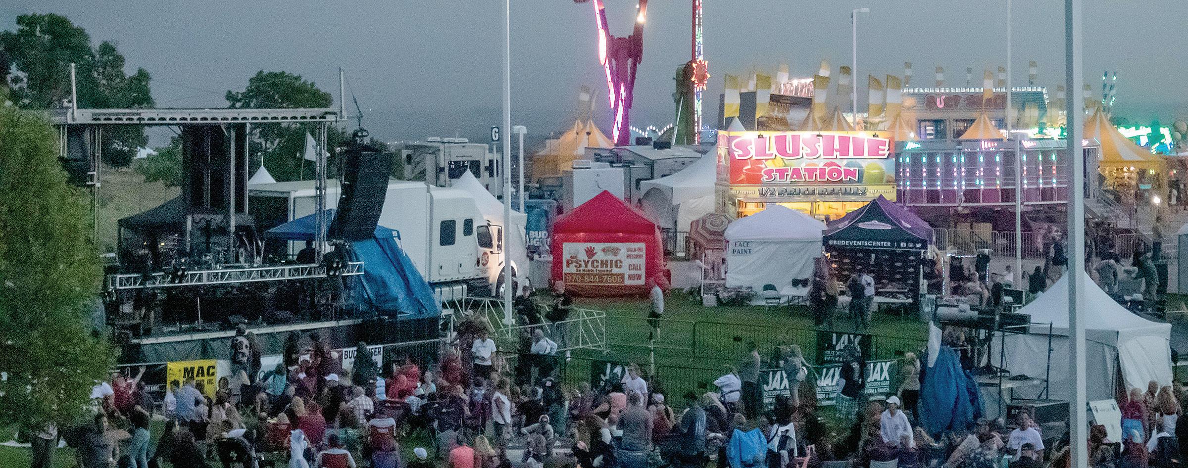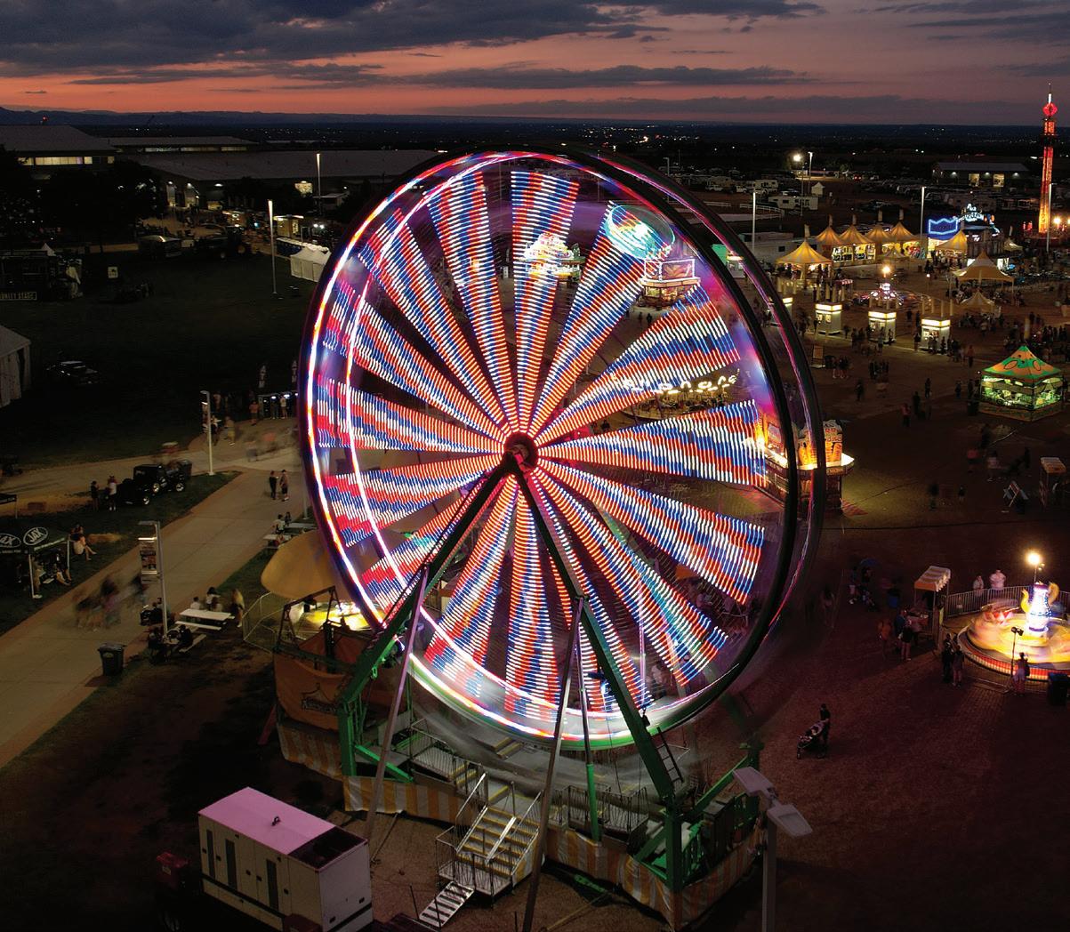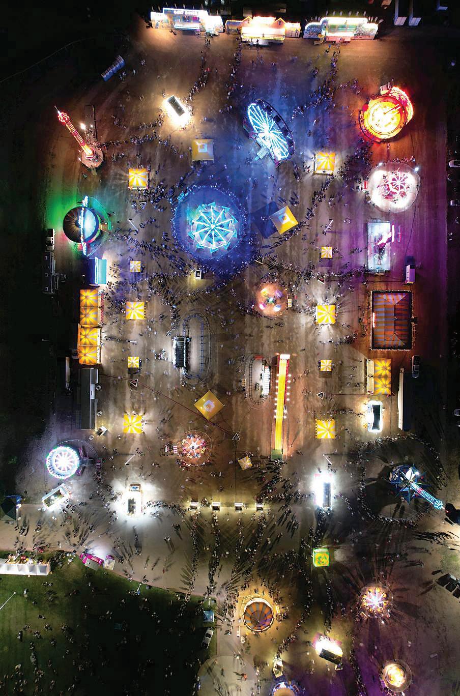 Drone shot of the Carnival Americana at dusk at 2023’s Larimer County Fair. Kyle Teramoto, Courtesy/The Ranch Events Complex