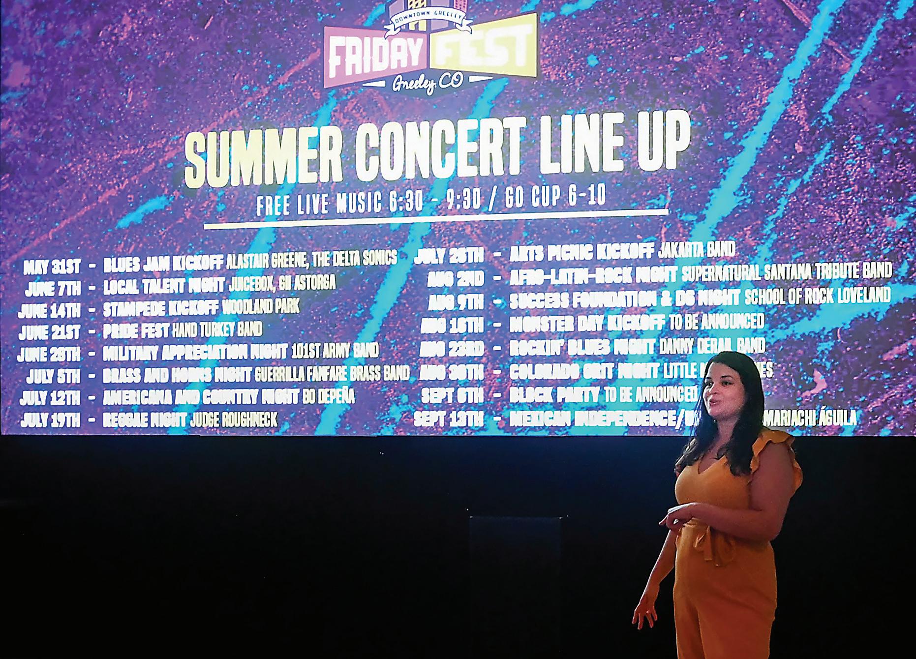 Daniela Hernandez talks about the Friday Fest Summer Concert lineup during a release party at the Kress in Greeley. Jim Rydbom/ Tribune Staff Photographer