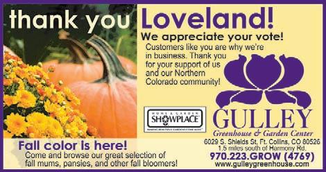 2010 2010 Thank You for Voting us Best Florist 2010! Open: Mon-Fri 7:30am-7pm; Sat. 8am-5pm; Sun. 10am-4pm 1300 E. Eisenhower Blvd Loveland, CO 80537 970-613-8000 order on-line at: www.floweramaloveland.com RC-316927 Classic Dozen Roses $39.99 As a thank you for supporting us through the Road Construction. Half off Delivery Charge. Must present coupon at time of purchase or mention this ad when calling. Expires Oct. 31, 2010. Not valid with wire orders. In store orders only. N Eisenhower Blvd. Ronald Reagan Blvd. Trade St. Union St. CenterraPkwy. 25 34 Culver’s of Loveland Intersection of Hwy. 34 and I-25, South of Centerra in the new development 2534 970-667-2475 • culvers.com At Culver’s we can’t think of anything better than serving up our creamy frozen custard and delicious classics cooked fresh the minute you order them. Which is why when we bring them to your table, they’re always accompanied by a warm smile So come on into your neighborhood Culver’s and see for you sandseeforyourself You might just be in lo oumightjustbeinlove by the time you lea ebythetimeyouleave Lo h Ta te. Ta h Love. © 2010 Culver Franchising S y stem, Inc. 2010 2010 RC-316803