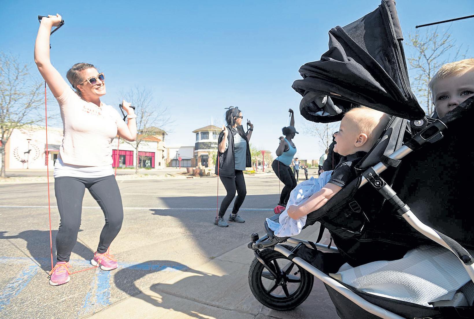 Above: Sitting is his stroller, Logan Bruntz, 9 months, smiles at his mom, Kelly Bruntz, left, as she exercises May 9 during a FIT4MOM fitness class at the Promenade Shops at Centerra in Loveland.