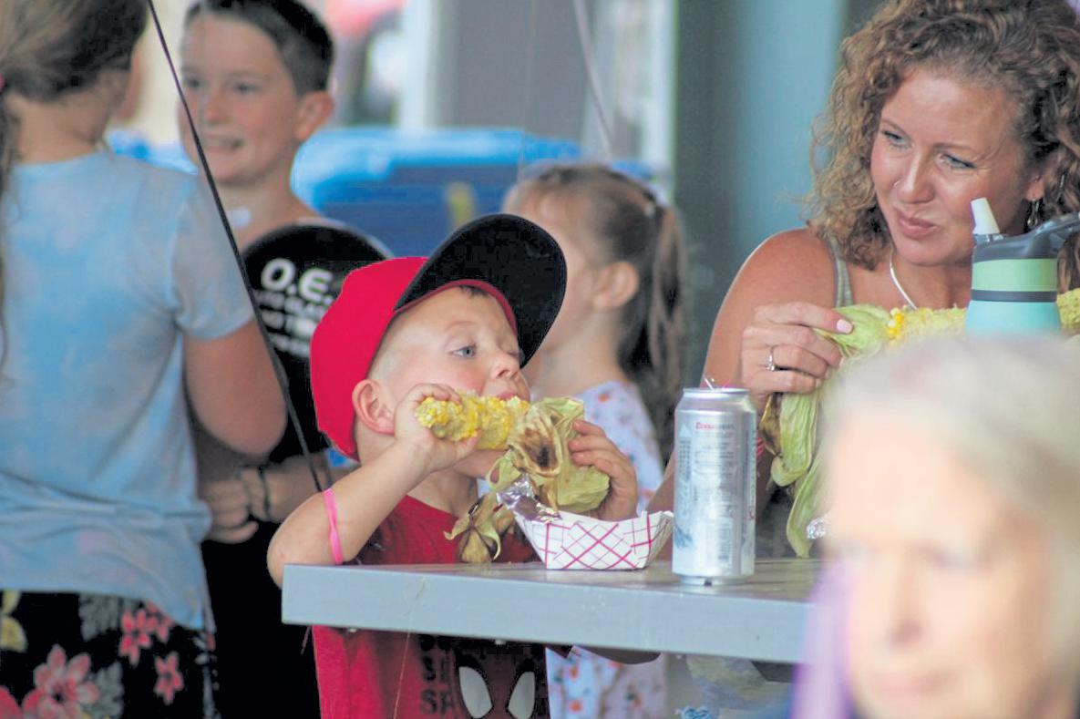Right: Cooper Jensen, 3, and his mom, Marty Varnon, eat corn during the 2022 Corn Roast Festival at Fairgrounds Park on Aug. 27.