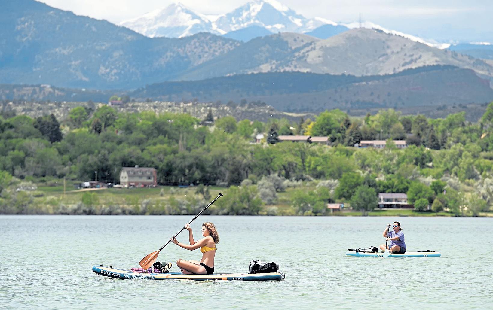 Above: Brooke Matheson of Loveland, 16, center, rows her paddleboard June 6 at Boedecker Lake in Loveland. Right: Vivian Garrett, 6, left, and Maggie Pott, 5, right, share a laugh while working on their self portraits June 13 during an Art Camp at the Wildfire Community Arts Center in Berthoud.