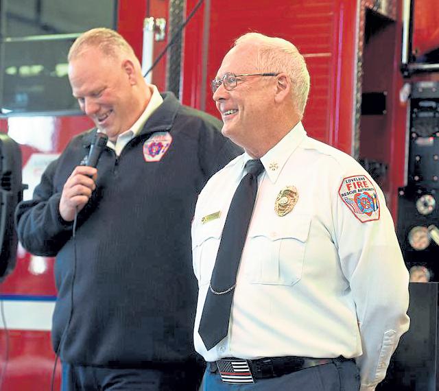 Jenny spaRks / Reporter-Herald Loveland Fire Rescue Authority Division Chief Ned Sparks, right, laughs as Division Chief Greg Ward reminisces Jan. 7 during a retirement ceremony for Sparks after 38 years of service.