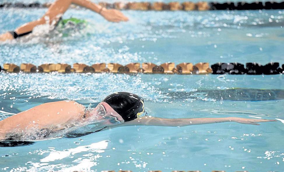 Rosie Whitaker, 4, plays in the splash area in the pool Jan. 10 at the new Berthoud Recreation Center. Meanwhile, the center’s new skate park is covered in snow outside.