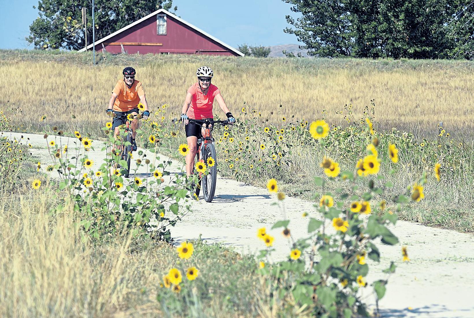 Jenny spaRks / Reporter-Herald DeAnn Schuler, right, and her husband, Clayton Schuler, ride their bikes on the recreation trail Sept. 7 at Sunset Vista Natural Area in Loveland. The couple, who recently moved here from Kansas, said one of the reasons they bought their house was because of its proximity to the Loveland trail system.