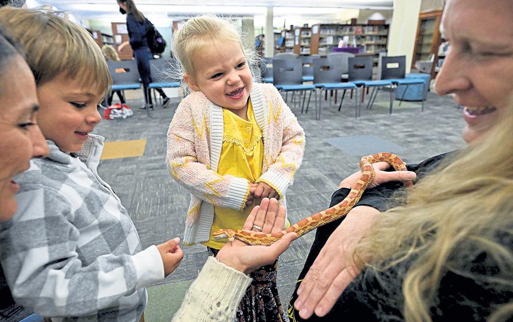 Evelyn Kliner, 2, center, reacts to a corn snake named Waffles held by his owner, Jennifer Folsom, right, during the Snakes and Scales and Spooky Tales event Oct. 3 at the Loveland Public Library. After listening to a story about reptiles, kids were able to see and touch the corn snake. William Moore, 3, left, reaches out to touch Waffles as his mom, Cass Moore, watches. Evelyn held Waffles and let him crawl around her arms and neck.