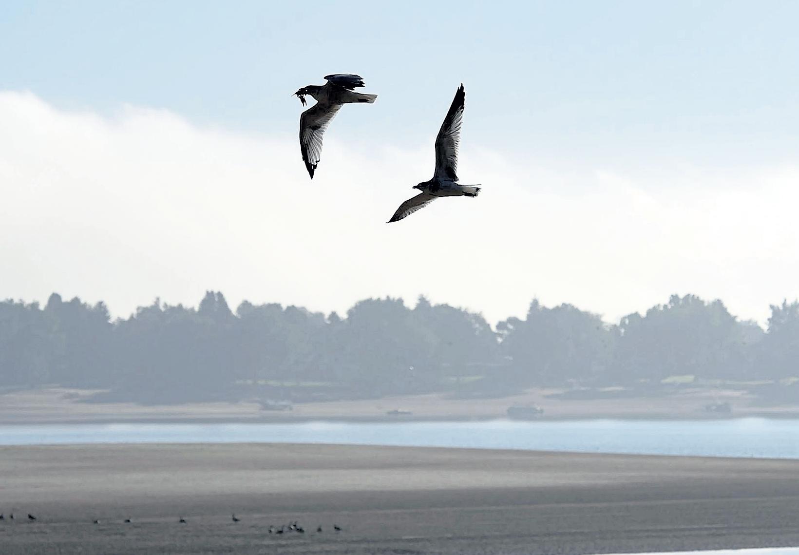 Above: A pair of birds, one with breakfast in its mouth, flies above Lake Loveland on Sept. 23 on a foggy morning.