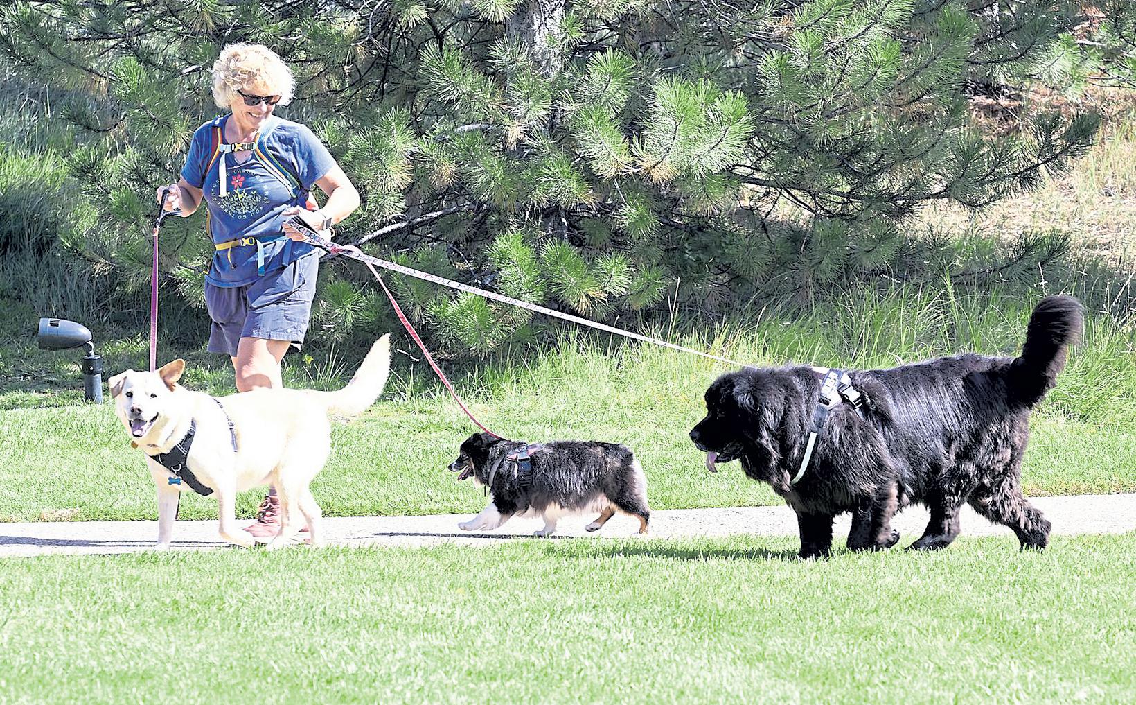 Above: Mary Jansen walks her dogs Charley, 7, left, Daisy, 10, center, and Molly, 5, right on Sept. 28 at Chapungu Sculpture Park at Centerra in Loveland. Right: Kyle Dallabetta, owner of The Muse coffee shop, chats with a customer Oct. 6 in Loveland.