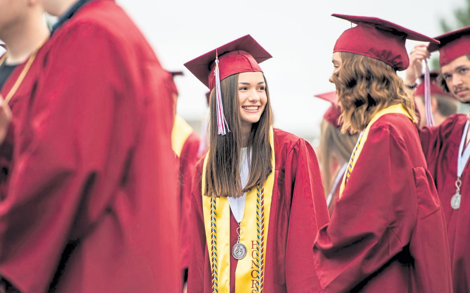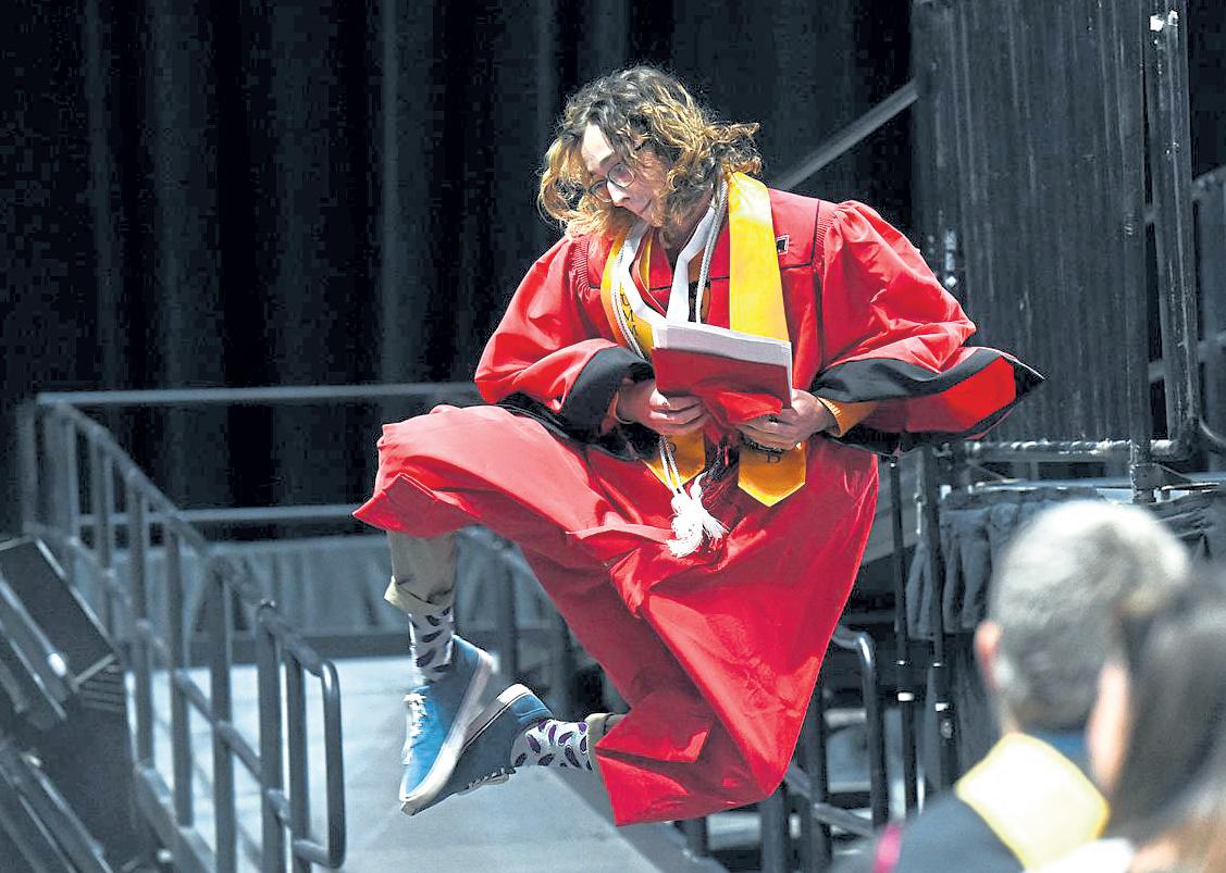 Above: Allison Hocker laughs with fellow Berthoud High School graduates May 28 during the graduation ceremony at Max Marr Stadium in Berthoud. Right: Loveland High School graduate Aaron Koso jumps in the air and clicks his heels in celebration after delivering a speech to fellow graduates May 28 during his graduation ceremony at The Ranch in Loveland.