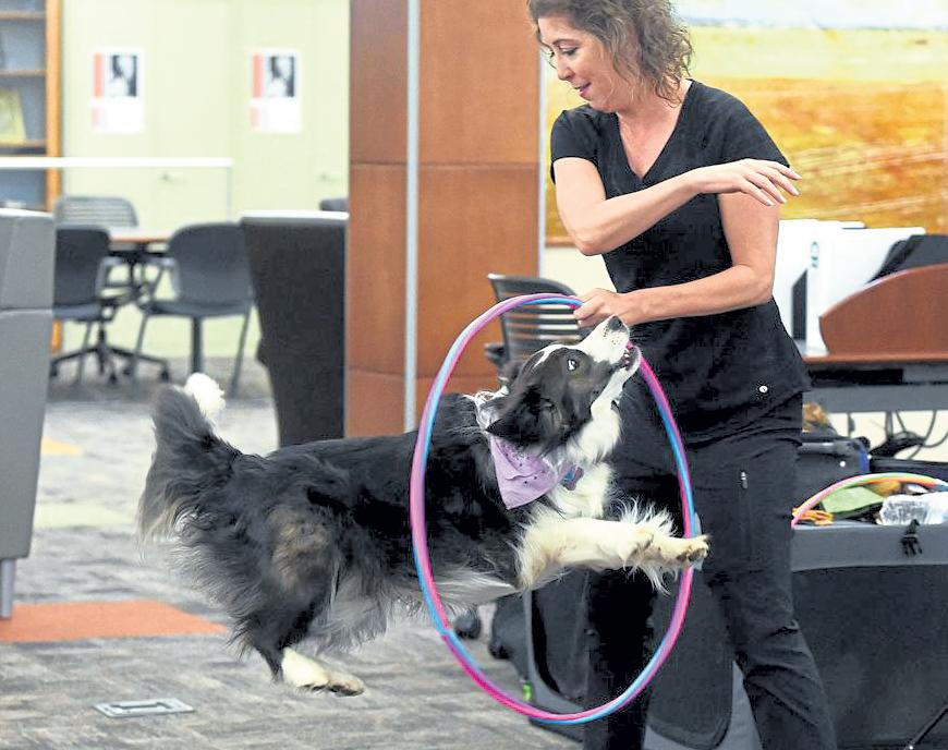 Jenny SparkS / reporter-Herald Kira, a 1-year-old border collie, jumps through a hoop held by her owner and trainer, Denise Gard, during a presentation from her Story Creations series July 28 at the Loveland Public Library.