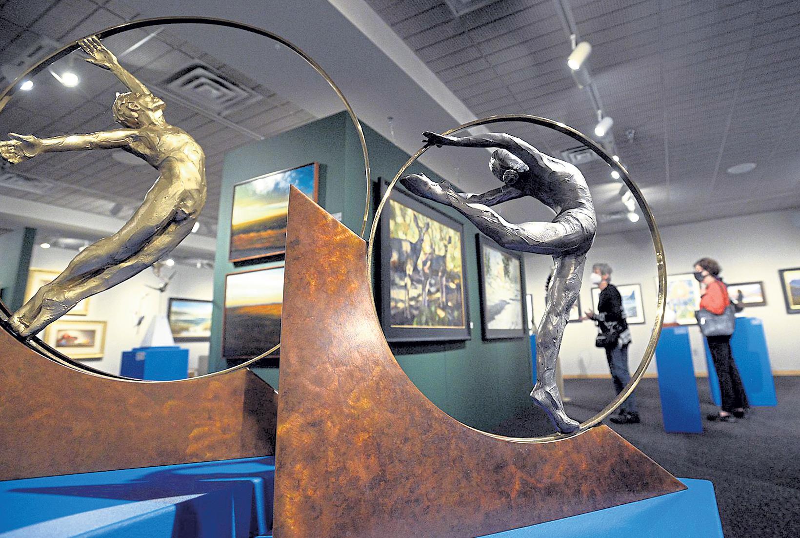 Jenny spaRks / Reporter-Herald Tess Heffernan, left, is framed by a bronze sculpture titled ’Dance Within Wear Only Skin’ by Loveland artist Denny Heskew, as she and Myra Powers, right, get a closer look at some pieces in the 31st annual Governor's Art Show on April 28 at the Loveland Museum in downtown Loveland.