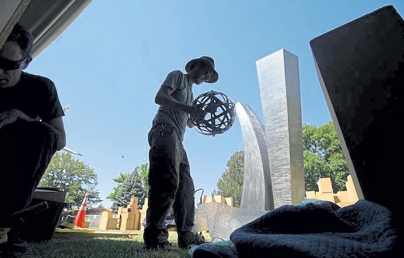 Jenny spARks / Reporter-Herald Greg Hoff, center left, and Jade Windell, center right, guide a sculpture titled ‘Open Window Monument’ by artist Ted Schaal onto its base as Doug Donahue, far right, drives the lift carrying the piece June 17 at Benson Sculpture Park in Loveland. Dan Herlihey, left, and Larry Braun, center, wait to help finish the installation.