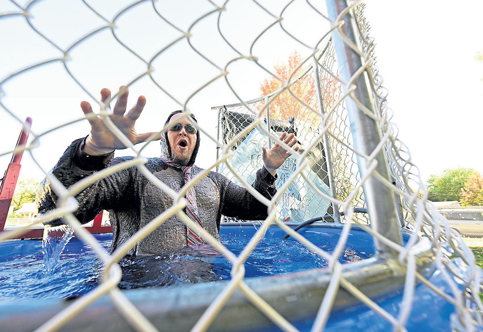 Jenny spaRks / Reporter-Herald Sporting a bear costume, Garfield Elementary School Principal John Kleiber reacts after plunging into cold water Oct. 19 outside the school in Loveland. Students exceeded a fundraising goal so Kleiber treated them by plunging into the icy water as they watched.