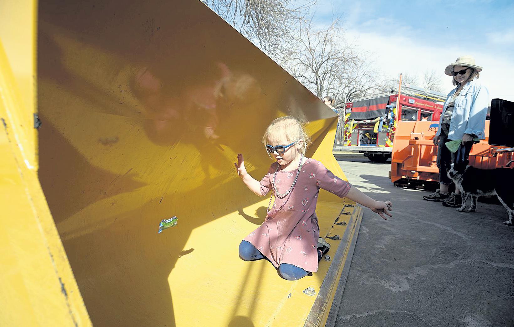 Above: Addison Maslen, 4, races her toy car inside the bucket of a backhoe March 3 as her grandma, Nonna Maslen, right, watches her during Children's Day at the Chilson Recreation Center in Loveland. Left: Loveland
