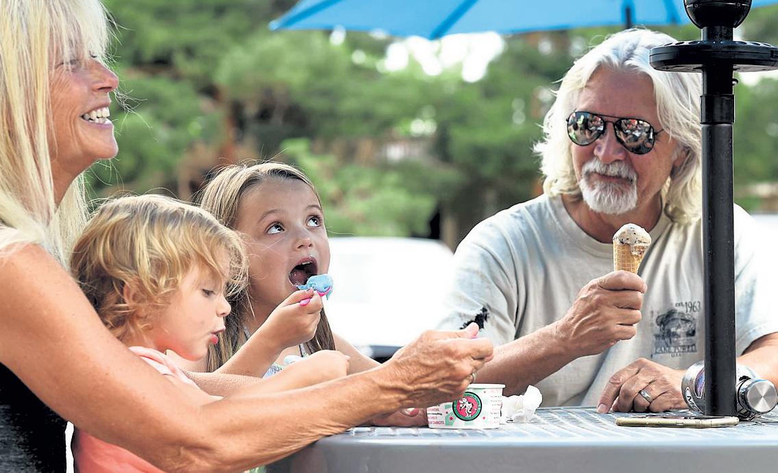 Peyton Kimball, 5, center, and her sister, Andi Kimball, 1, left, take bites of their ice cream July 22 with their grandparents, Patty Kimball, left, and Kent Kimball, right, at I Scream Ice Cream in west Loveland. After going swimming, they thought it would be another good way to beat the heat.