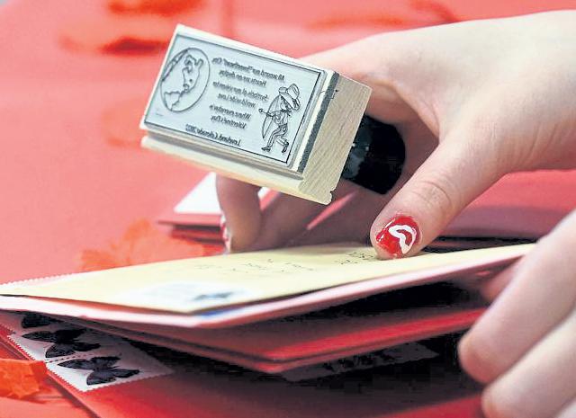Jenny spaRks / Reporter-Herald Miss Loveland Valentine Olivia Friske stamps the first valentine during the Jan. 31 kickoff to the Loveland Valentine Remailing Program at the Chamber of Commerce. The valentine was on its way to Australia.
