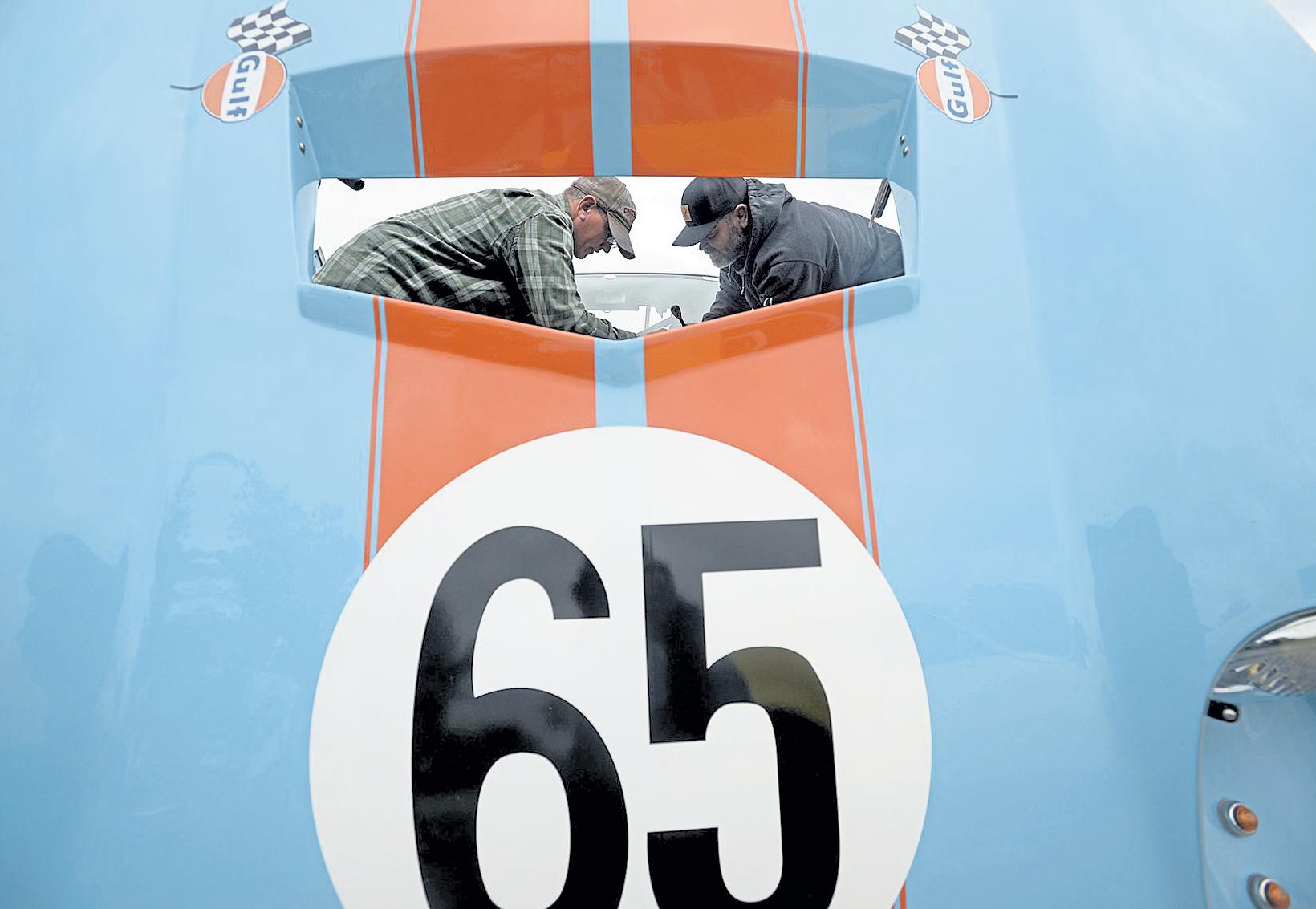 Jenny spaRks / Reporter-Herald Walt Meinhardt, left, and Wes Drelleshak are framed by a vent in the hood as they work on a 1965 Daytona Replica car Sept. 9 before racing it on the autocross track during the Good Guys Car Show at The Ranch in Loveland. The car is part of collection owned by Pat Sheely.