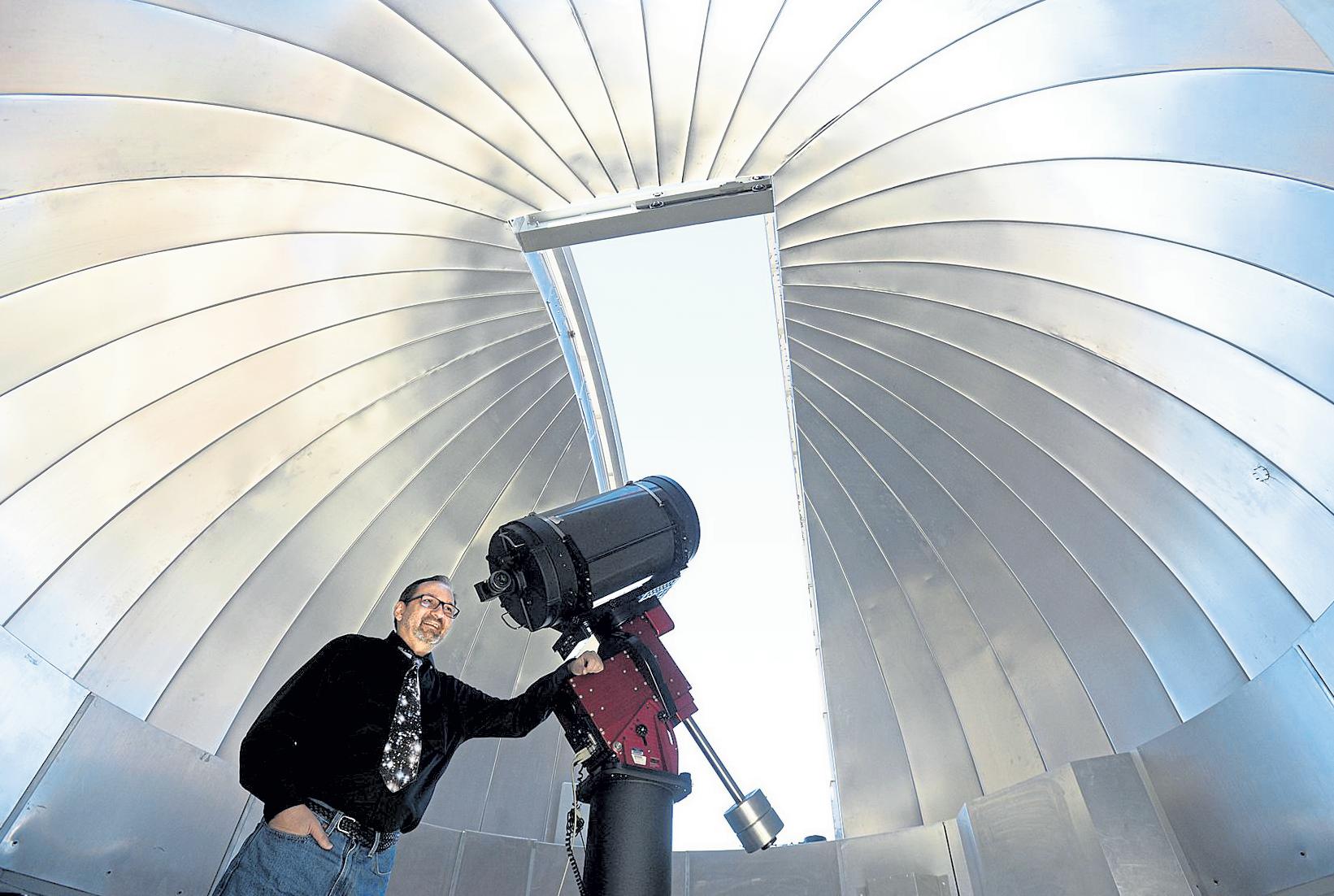 Above: Astronomer Andrew Caldwell poses for a photo in the observatory near the telescope March 15 at Front Range Community College in Fort Collins. Left: Karen Garner's daughter Allisa Swartz, hugs her brother, John Steward, outside the Larimer County Justice Center after former Loveland police officer Austin Hopp pleaded guilty to felony assault March 2 for his connection to the 2020 arrest of Karen Garner.