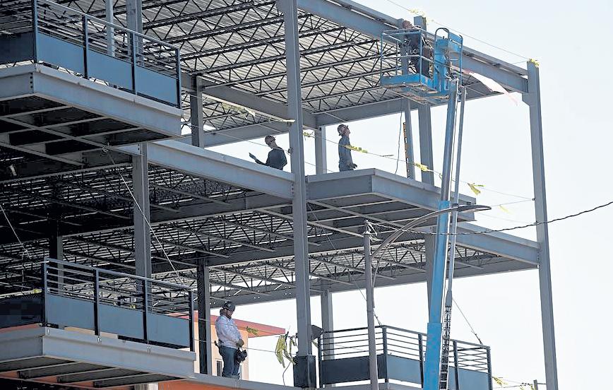 Above: Benjamin Bonner, left, and Ismael Gallardo, right, both heavy equipment operators with the Loveland Solid Waste Division, move heart arches from a truck into place in the walkway near the MetroLux Theater in the Foundry Plaza Feb. 9 in preparation for the Sweetheart Festival in Loveland. Right: Christopher Sierra with Briar Electric works to install new exterior lights Feb. 8 at 444 N. Lincoln Ave. in downtown Loveland. The downtown space that once housed a longtime Loveland karate studio was looking to reopen in the spring, as The Meat Revolution, a shawarma restaurant.