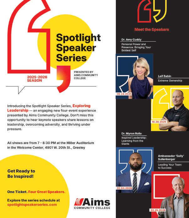 Four nights. Four unforgettable stories. One powerful theme: Exploring Leadership. This fall and spring, Greeley will welcome speakers typically seen at national conferences in major cities. Thanks to Aims Community College’s new Spotlight Speaker Series, Northern Colorado professionals and community members can engage in transformational conversations close to home.