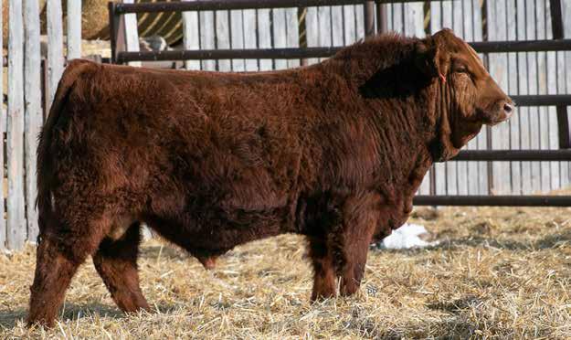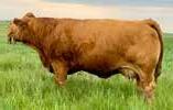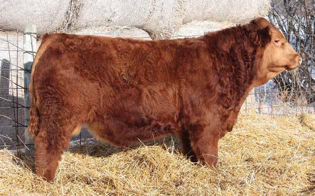 Our top adj yearling wt. He is dark red, long bodied, with a great top and full deep rear quarter. He has tons of hair which is a bonus during Manitoba cold snaps. His EPDs are breed average across the board. Probably as good a bull as I have raised and he just happens to have a house cat disposition to add to the package. We have just calved a 2 yr old full sister who is the kind anyone could use a bunch of. HOMO POLLED BY PARENTAGE