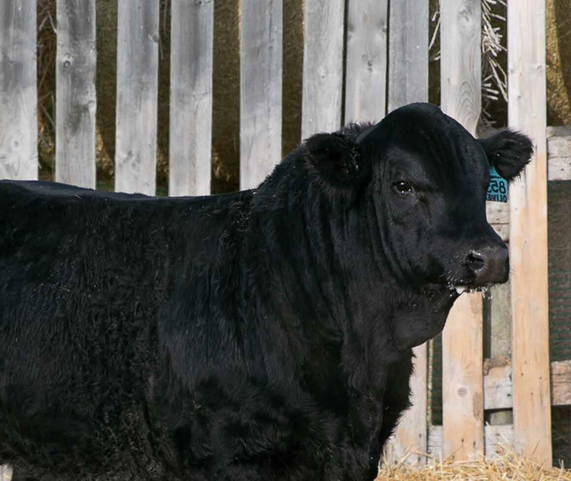 Our 2nd highest adj weaning wt, who suffered a bit of an injury, probably playing with his pen mates, early in the winter which set him back a bit. Now fully recovered, he’s back on track. He is moderate framed, has a good top, deep rear quarter and a thick hair coat. His sire was the 2021 high seller at the prestigious Wheatland bull sale and there will be limited sons available this spring and only a few of those will be black.