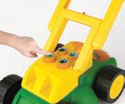 Interactive John Deere lawn mower with rotating grass clippings. Press button for sound and music. Includes (3) "AA" batteries.