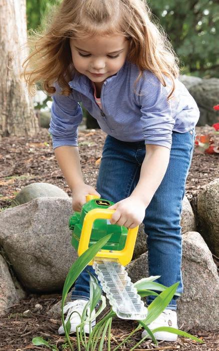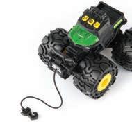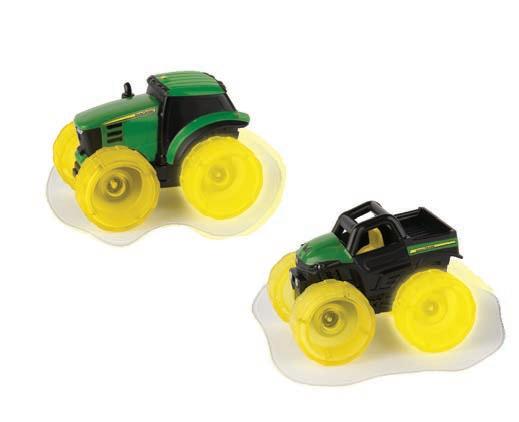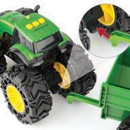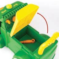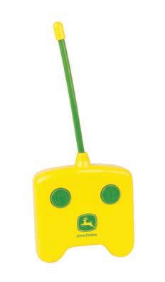 Squeeze cab to start tractor engine, flip open hood, and turn on light. Free rolling wheels for push along fun. Includes (2) “AA” batteries.