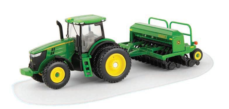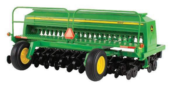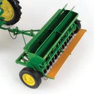 Constructed with die-cast metal. The tractors is configured with narrow front axle and gas engine detail. The grain drill can hitch to the tractor and features opening panels. One time production – While supplies last.